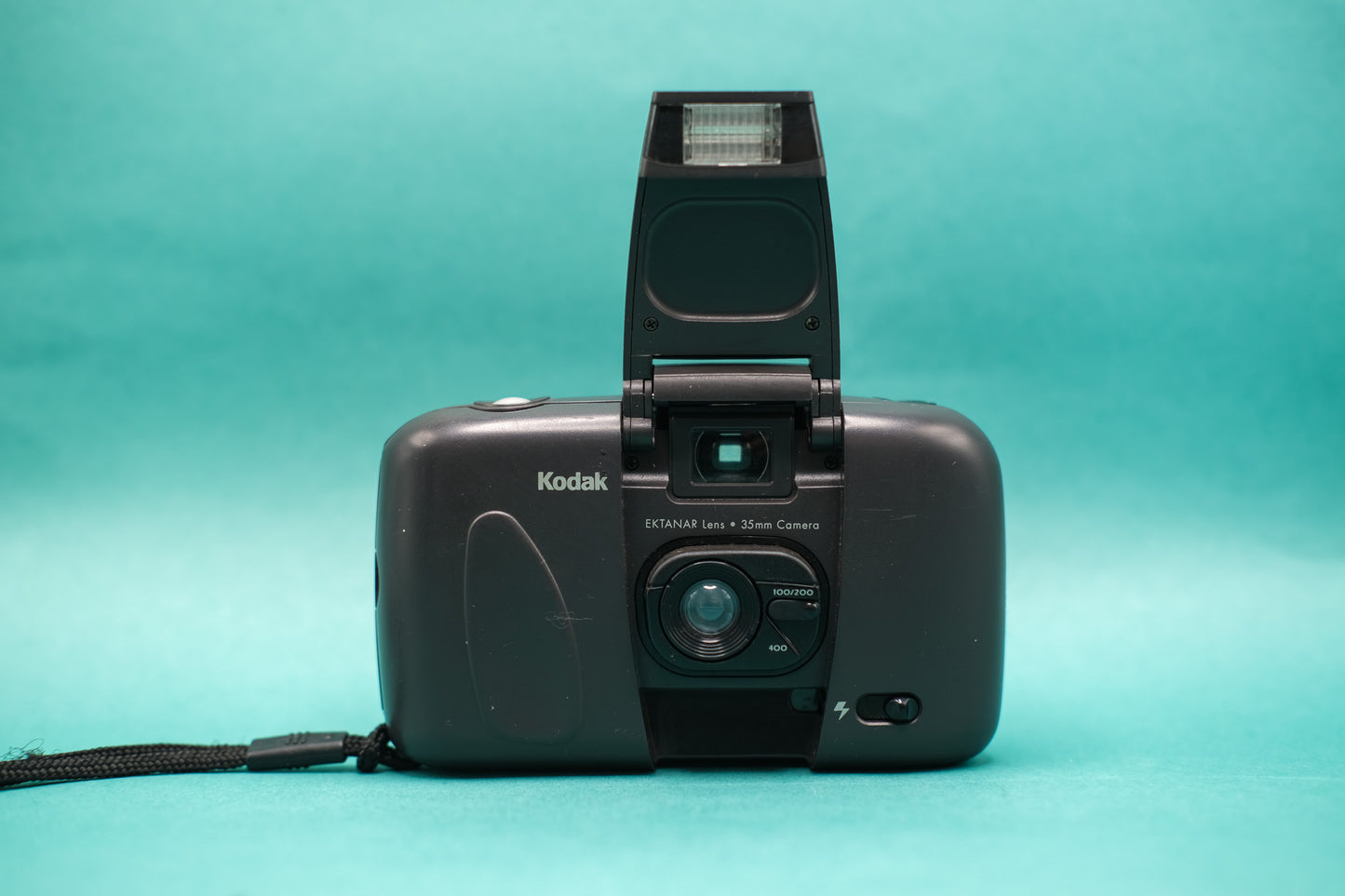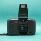 This is a fully manual camera that you load, advance and rewind on your own. It has flash and it very compact.